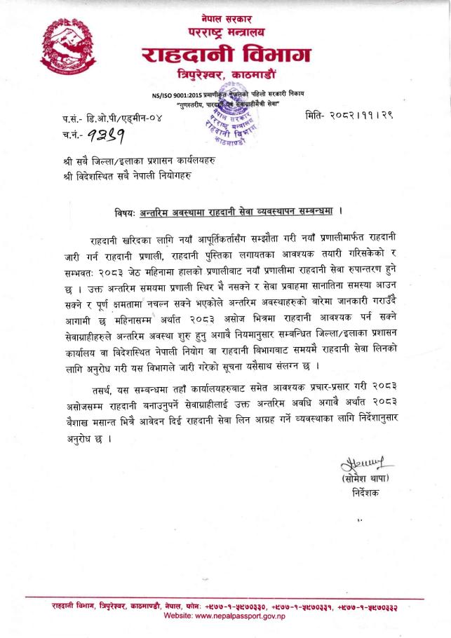 अन्तरिम अवस्थामा राहदानी सेवा व्यवस्थापन सम्बन्धमा ।