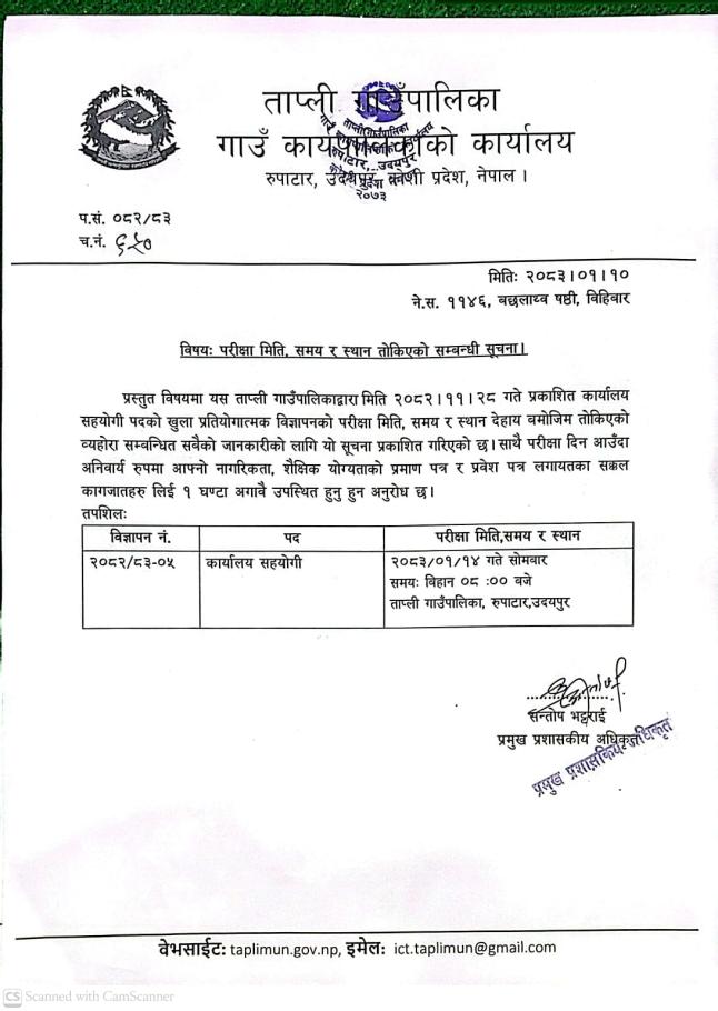 कार्यलय सहयोगि पदको परीक्षाको मिति, समय र स्थान तोकिएको सम्बन्धी सूचना।
