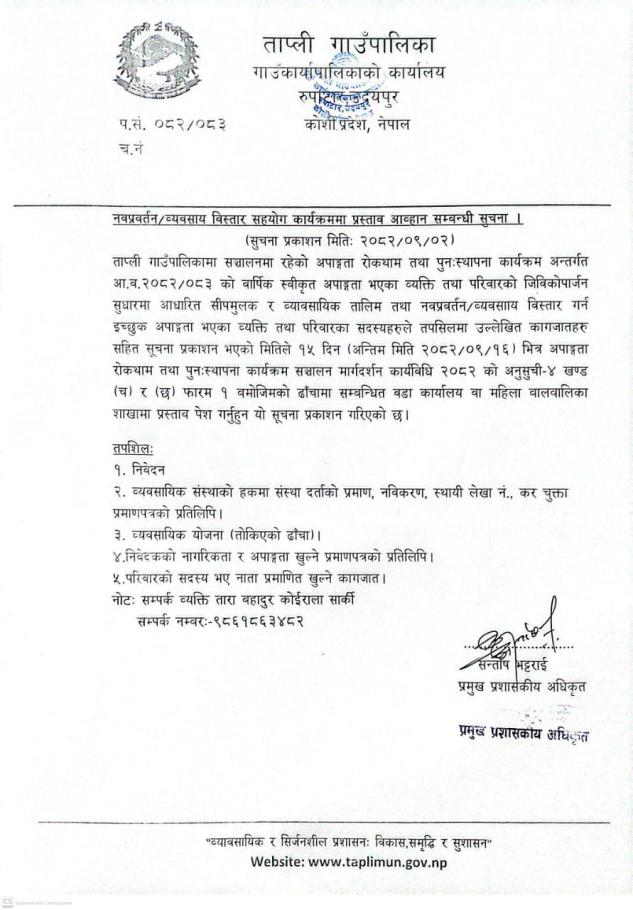 नवप्रवर्तन/व।यवसाय विस्तार सहयोग कार्यक्रममा प्रस्ताव आव्हान सम्बन्धी सूचना !
