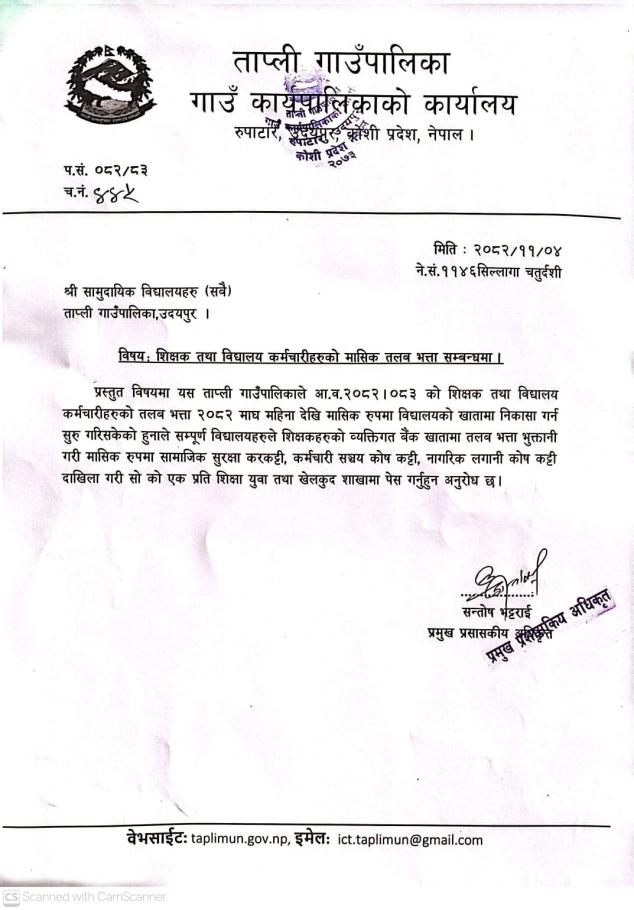 शिक्षक तथा विद्यालय कर्मचारीहरुको मासिक तलब भत्ता सम्बन्धमा ।