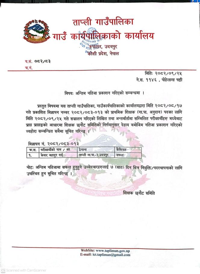 अन्तिम नतिजा प्रकाशन गरिएको सम्बन्धमा ।