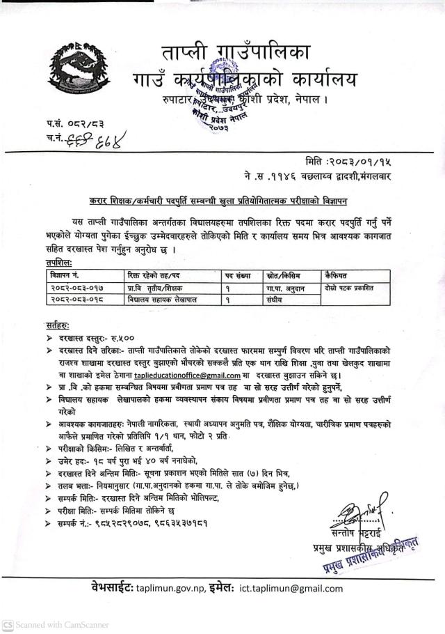 करार शिक्षक/कर्मचारी पदपुर्ति सम्बन्धी खुला प्रतियोगितात्मक परीक्षाको विज्ञापन